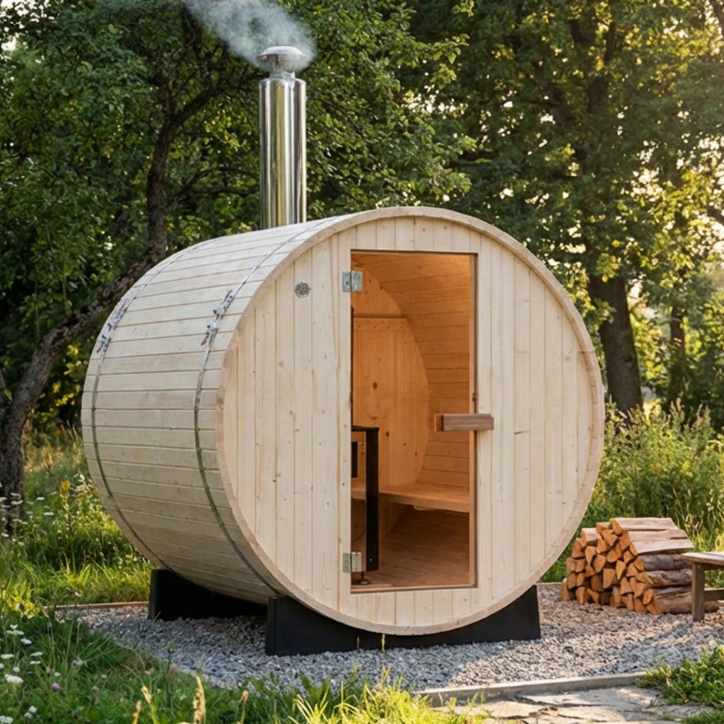 薪ストーブ付属でお届けする、手軽に本格サウナを始められるバレルサウナです。3~4人で利用できるちょうど良いサイズ感と、樽型フォルムの美しいデザインが自宅の庭を特別な空間に変えます。木材の自然な色合いと温もりを活かしたシンプルなデザインで、家族や友人との楽しいサウナタイムを演出。コンパクトなサイズで設置場所を選ばず、フィンランド式ロウリュサウナを気軽にお楽しみいただけます。