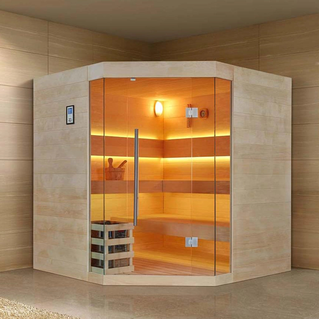 部屋の角にぴったりフィットするコーナータイプの屋内設置型フィンランド式ルームサウナです。木材の温かみを活かしたシンプルで美しいデザインが特徴で、限られた空間を最大限に活用できます。2つのサイズから選択可能で、家族でのリラックスタイムに最適です。強化ガラスを使用したガラス面により、開放感のあるサウナ空間を実現し、安全にご使用いただけます。