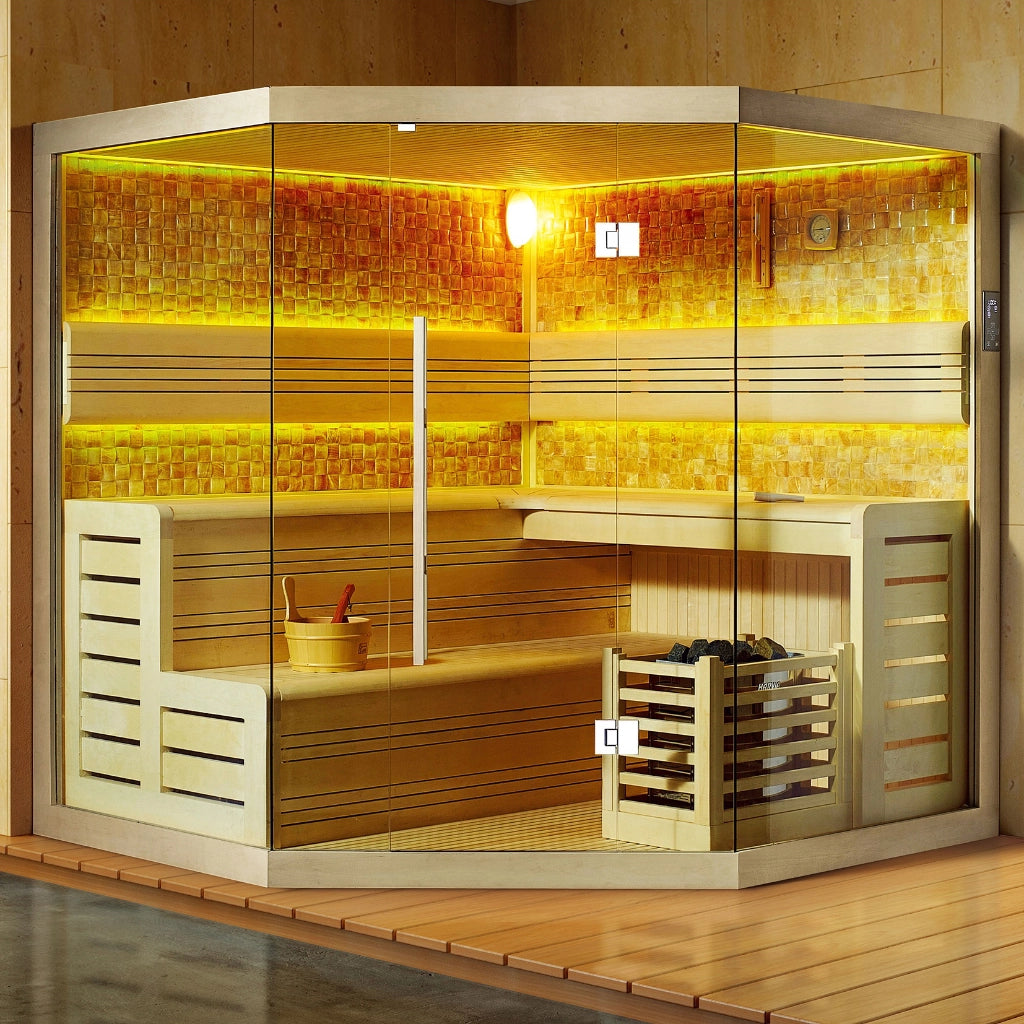 屋内設置型の大きなフィンランド式ルームサウナです。自然を感じるシンプルで美しいデザインが特徴で、部屋の角にぴったりと収まり、空間を有効活用できます。2面にガラスを採用した開放的な構造により、圧迫感を感じることなく快適にサウナをお楽しみいただけます。3つのサイズから選択可能で、家族での利用はもちろん、ジムなどの業務用施設にも対応可能です。強化ガラスを使用しているため、安全性も確保されています。