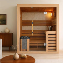 家族での利用に最適な3~4人用の屋内型自宅サウナです。スペースを有効活用したL字型の2段ベンチにより、複数人でも快適にお使いいただけます。ロウリュもできるフィンランド式を採用し、あなたの居住空間をスパのようなリラクゼーションエリアに変えることができます。シンプルで洗練されたデザインで、どんなインテリアにも自然に溶け込み、家庭での上質なサウナ体験を提供します。