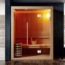 2~3人用のシンプルで美しい家庭用サウナです。入口側のガラス扉から自然光が差し込み、木材だけで構成された温かみのある空間を明るく照らします。余計な装飾を省いたミニマルなデザインで、天然木本来の美しさと香りを存分に楽しめます。本格的なフィンランド式ロウリュにも対応し、シンプルながら本格的なサウナ体験をご自宅で気軽にお楽しみいただけます。どんなお部屋にもすっきりと溶け込む、現代的で洗練されたデザインです。