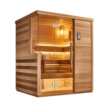 最大3人で利用できる、ロウリュにも対応した屋内型のフィンランド式家庭用サウナ。木材を活かしたナチュラルなデザインで、ご自宅をスパのようなリラクゼーション空間に変えることができます。家族や友人との特別なひとときを、プライベートな空間で心ゆくまでお楽しみいただけます。
