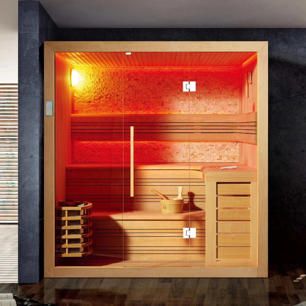 家族での利用に最適な3~4人用の屋内型フィンランド式サウナです。ロウリュもでき、木材を活かしたシンプルで洗練されたデザインが特徴。付属のLEDライトは赤・緑・青・黄と色を変えることができ、その日の気分に合わせたリラックス空間を演出できます。どんなインテリアにも自然に溶け込み、家庭での上質なサウナ体験を提供します。